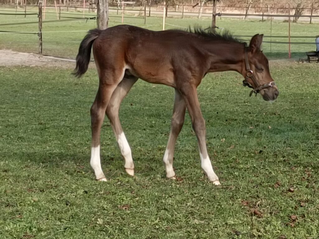 Op zondagavond 22 maart is DEquiC’s Calzini geboren. 11 dagen over de tijd. Een hengstveulen met vier sokjes. Vandaar de naam Calzini. Dat is Italiaans voor sokjes.